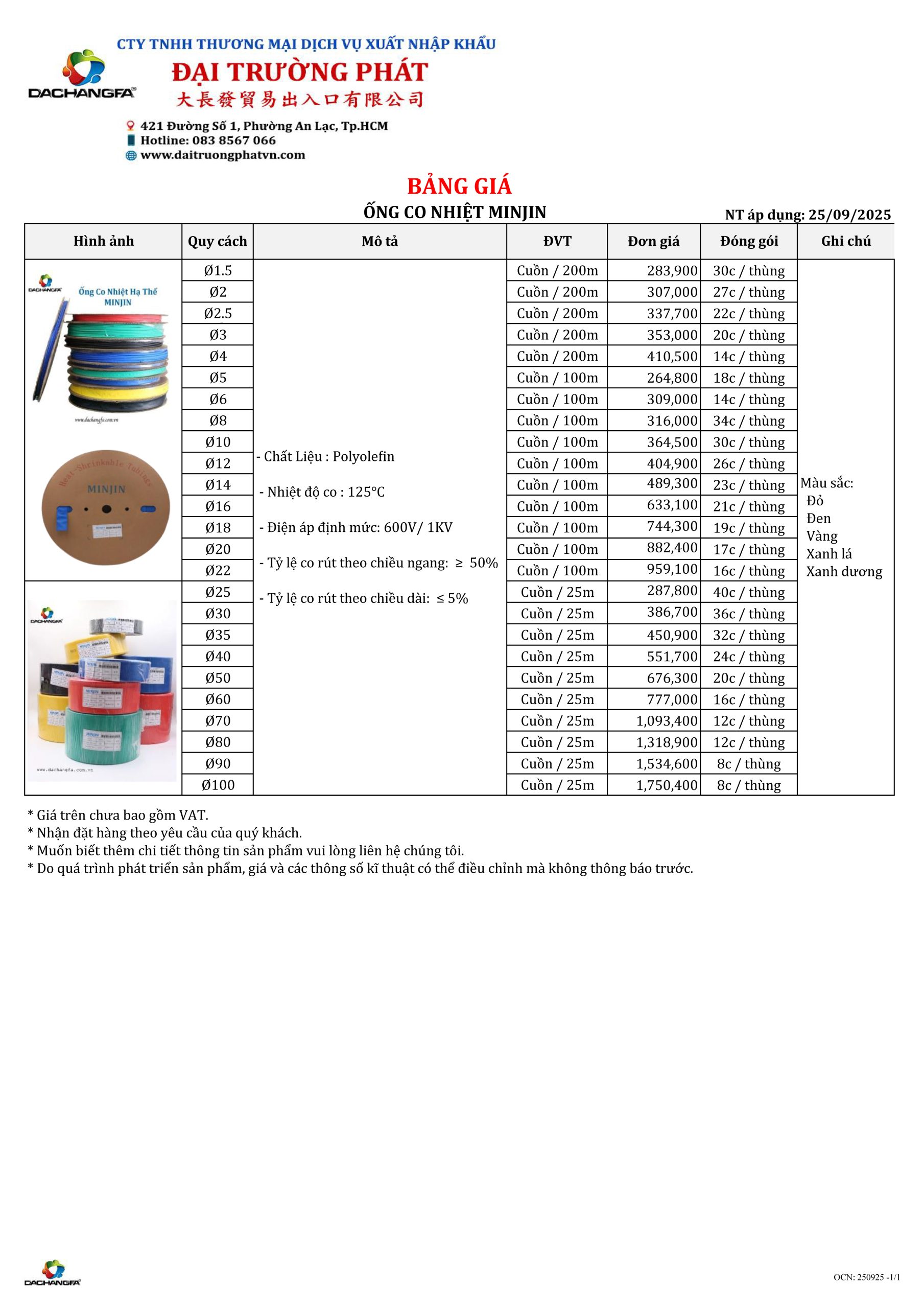 Cập nhật bảng giá Ống co nhiệt MINJIN mới nhất từ Đại Trường Phát.