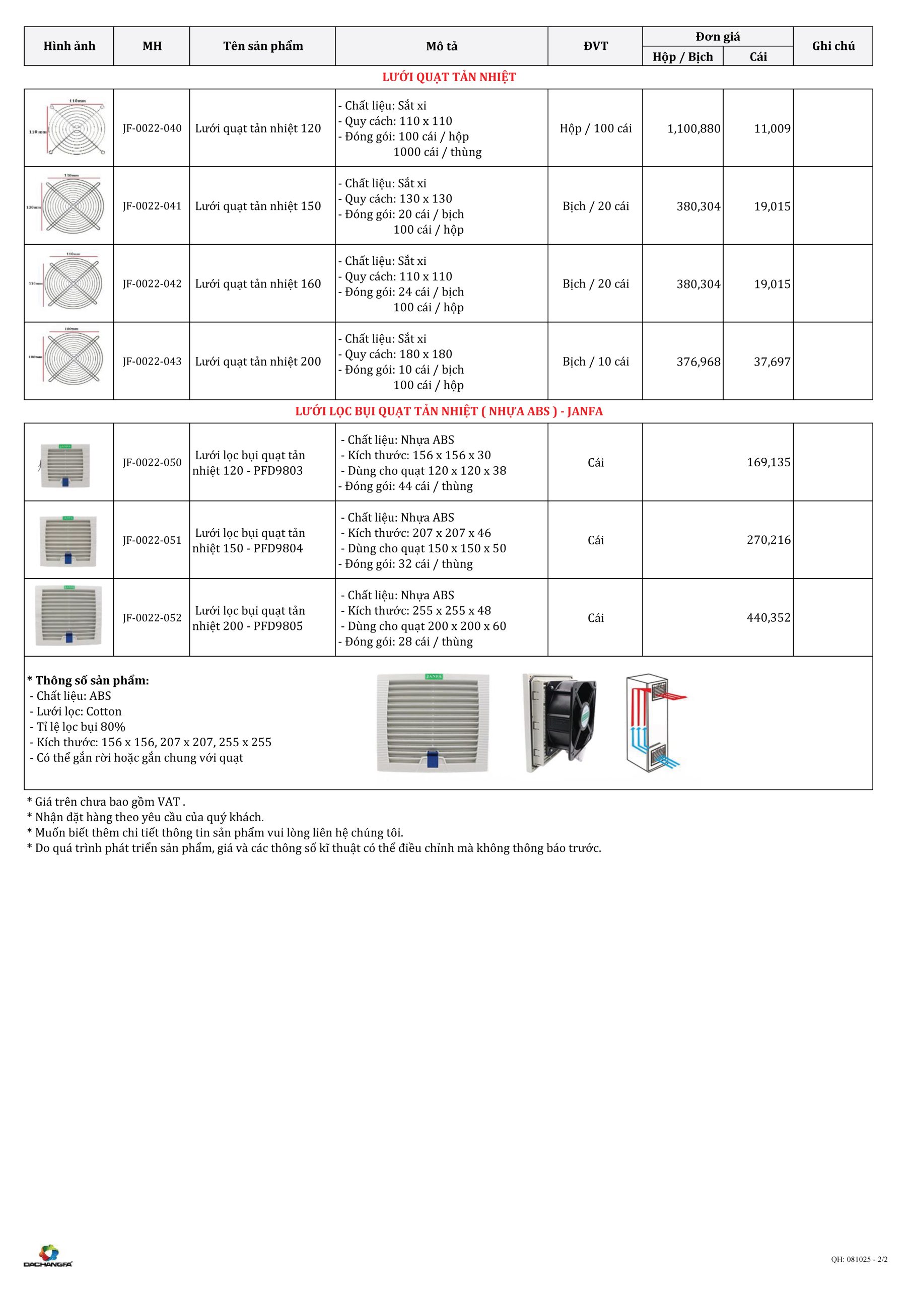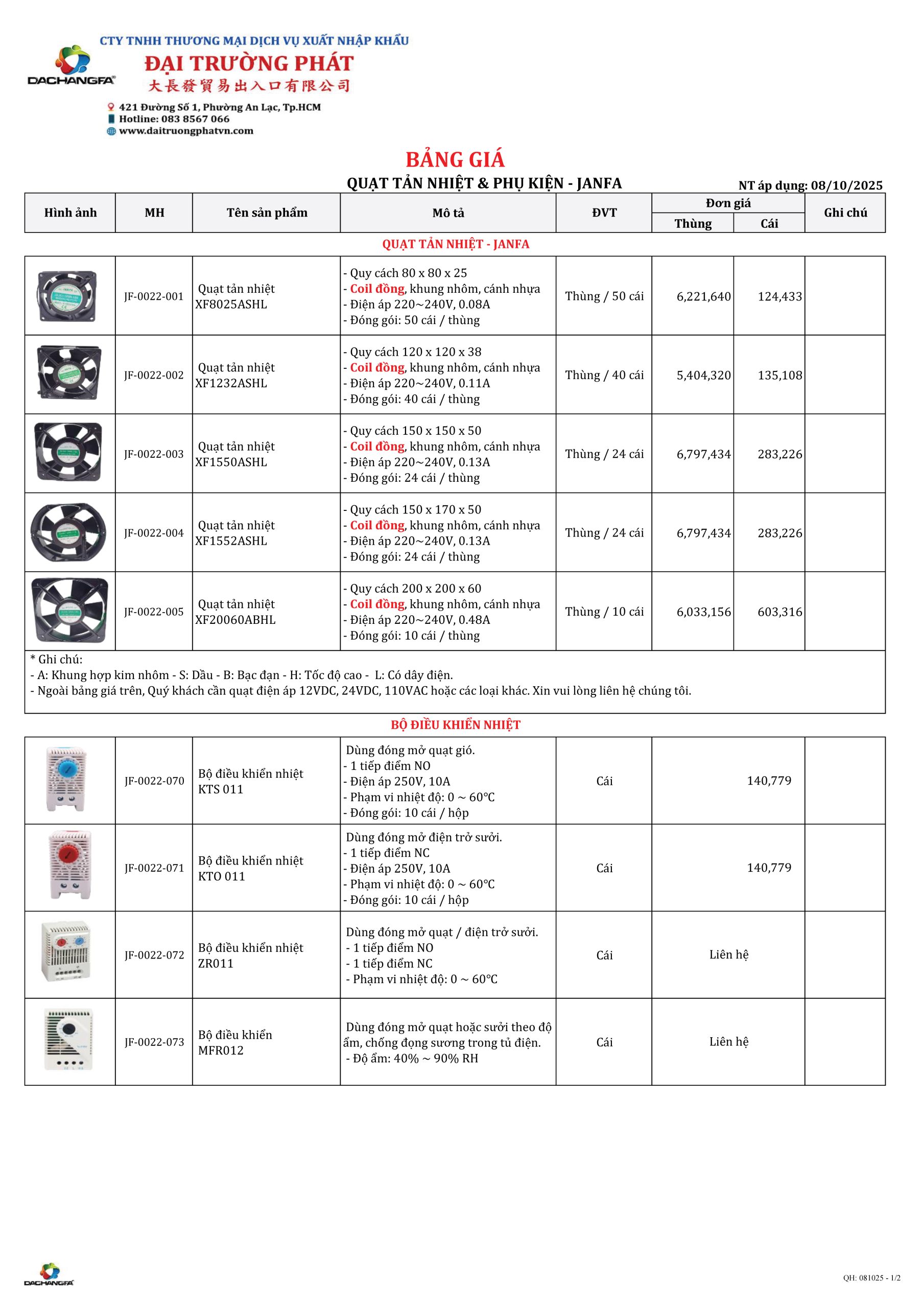 Cập nhật bảng giá Quạt tản nhiệt – Công tắc nhiệt JANFA mới nhất từ Đại Trường Phát.