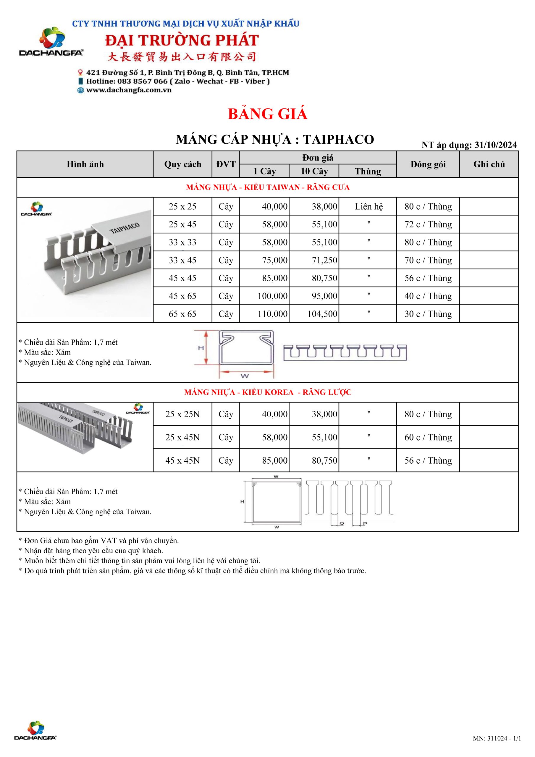 Cập nhật bảng giá Máng cáp nhựa Taiphaco mới nhất từ Đại Trường Phát.