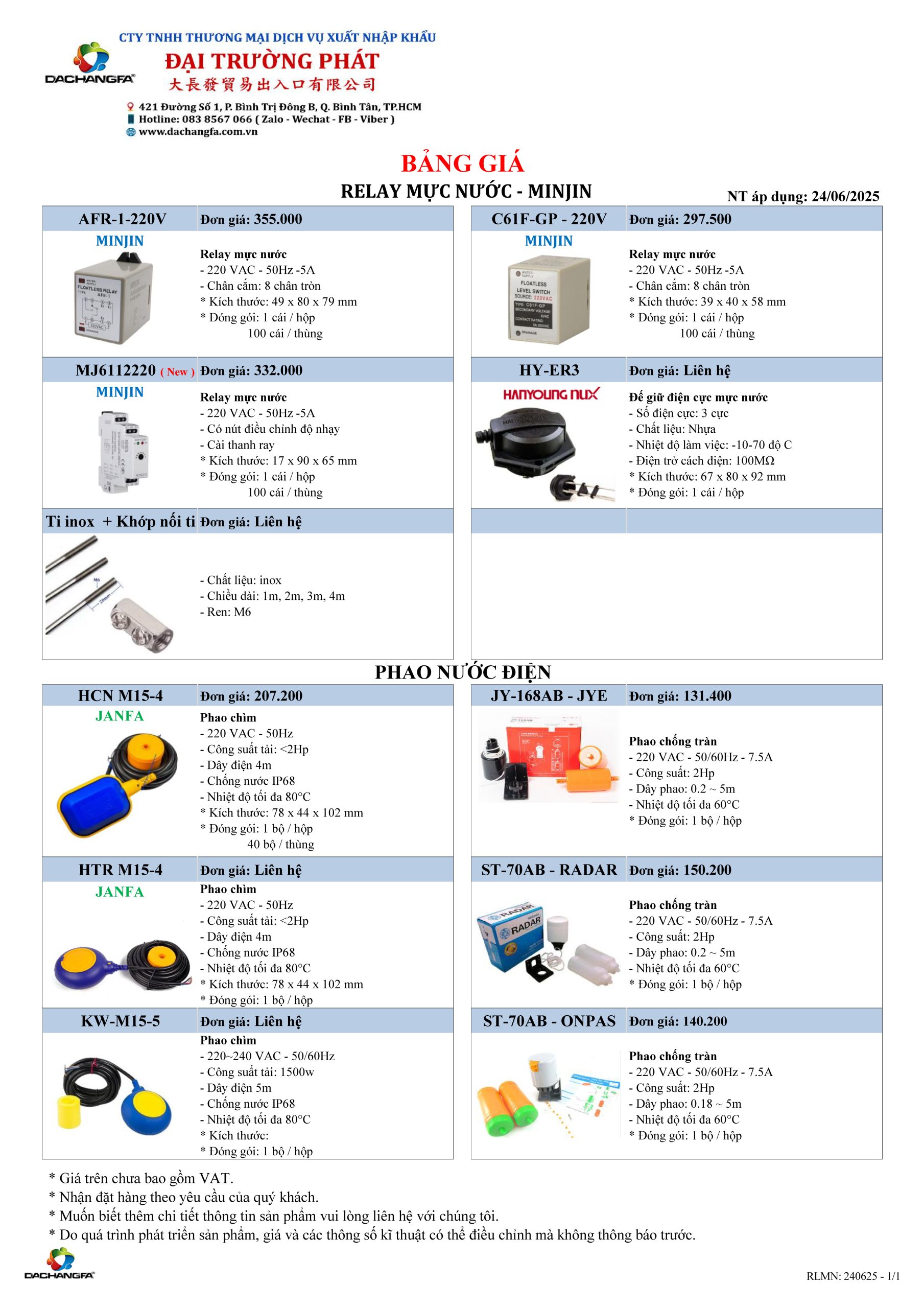 Cập nhật bảng giá Relay mực nước MINJIN mới nhất từ Đại Trường Phát.