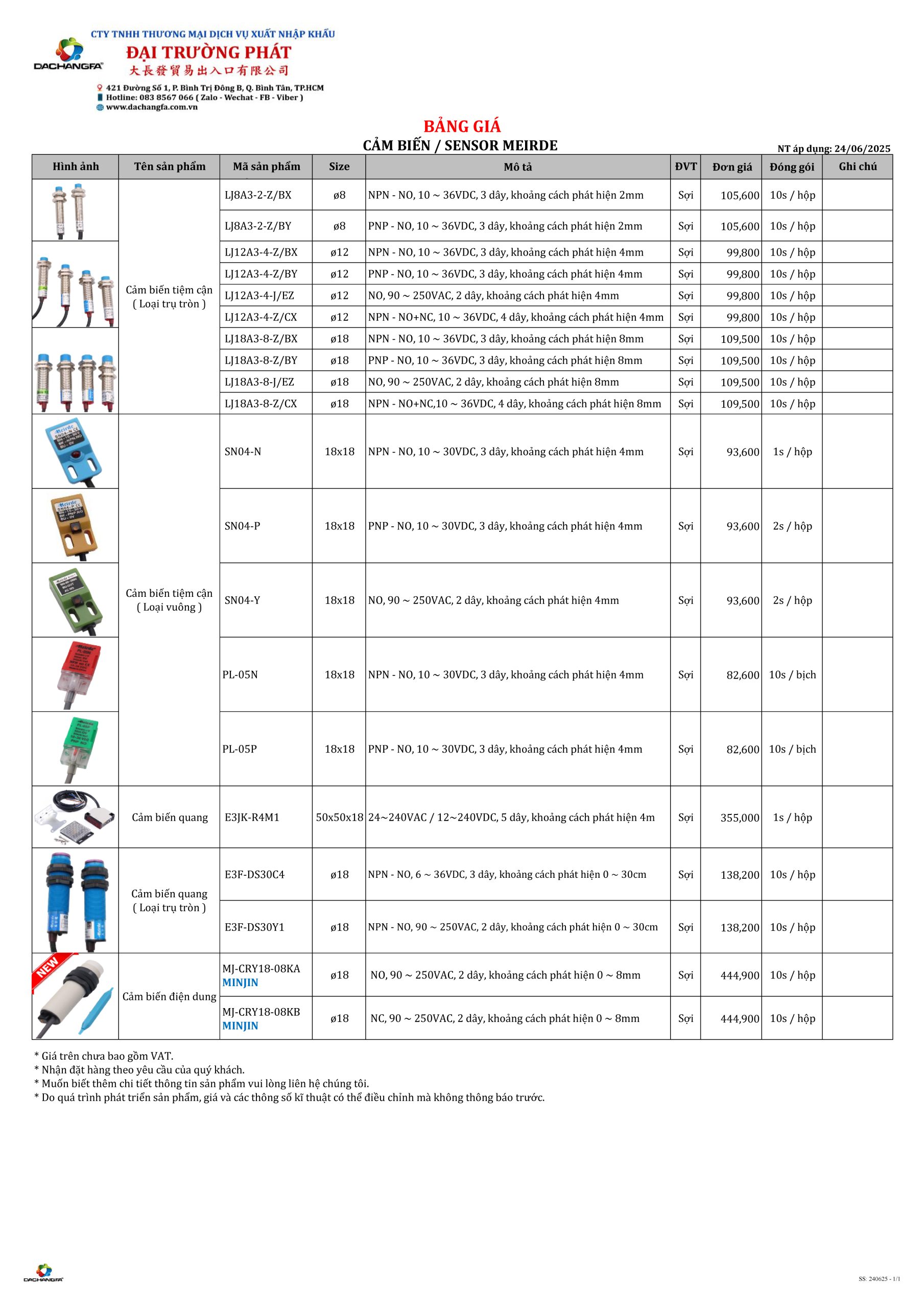 Cập nhật bảng giá Sensor MEIRDE mới nhất từ Đại Trường Phát.