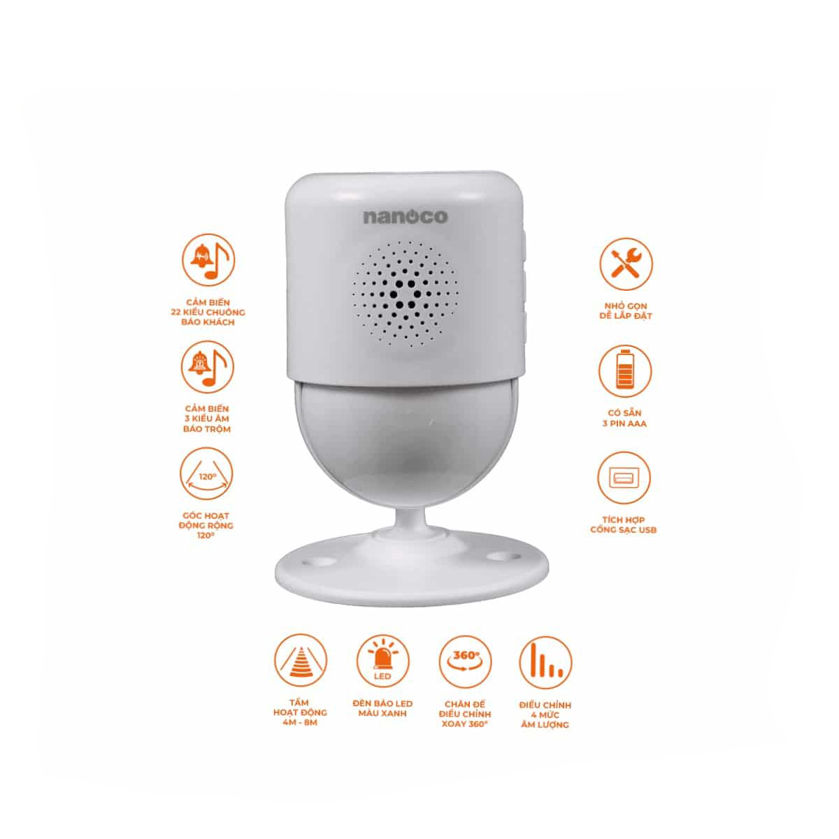 Chuông báo cảm biến Nanoco NJX378 là sản phẩm thế hệ mới, sử dụng công nghệ cảm biến hồng ngoại để phát hiện chuyển động trong khu vực cần kiểm soát. Được thiết kế đơn giản với màu trắng làm chủ đạo, sản phẩm góp phần giúp không gian lắp đặt trở nên sang trọng, thanh lịch, hài hòa về mặt thẩm mỹ.