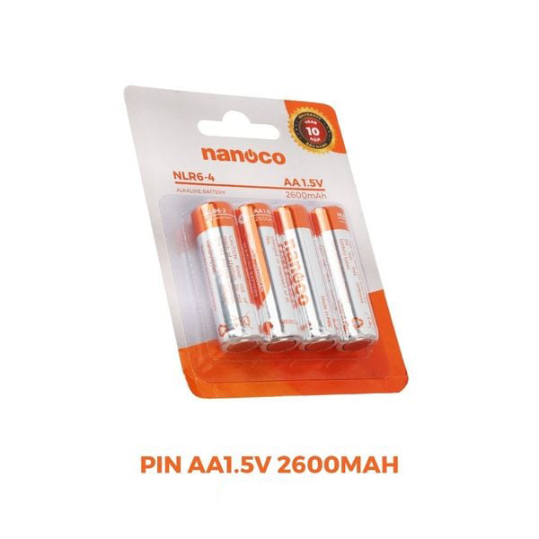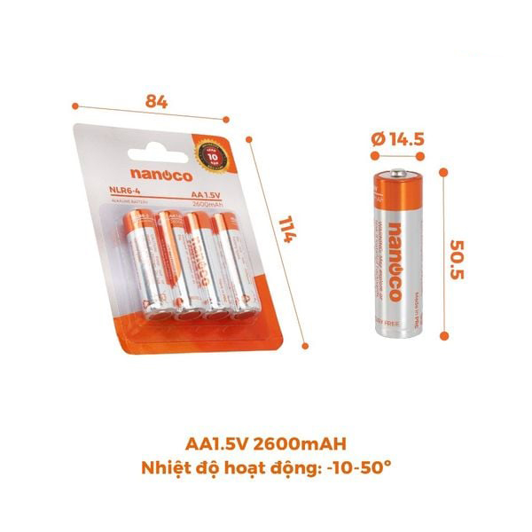 Pin NanocoNLR6-2-NLR6-4 thuộc dòng Alkaline AAA với điện áp 1.5V và dung lượng 2600mAh, mang đến nguồn năng lượng ổn định, lý tưởng cho các thiết bị điện tử gia dụng như điều khiển, đồng hồ, máy ảnh hay đồ chơi trẻ em.